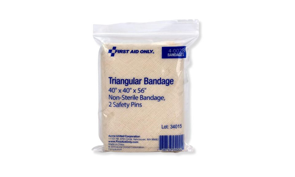 Triangular BandageThe Triangular Bandage is a multi-purpose first aid tool used to treat cuts, sprains and larger wounds. It can also be used as a sling to support arms, shoulders, applied as a pressure dressing, or immobilize the hands or feet. Manufactured of 100% cotton-strong muslin providing a consistent high quality product. Individually packaged in a polybag including 2 safety pins. Size: 40" x 40" x 56" (100cm x 100cm x 142cm) |