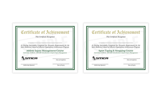 University of Alberta KIN 240 Student OptionsKIN 240 - Introduction to Sports Injury Management: Analysis of practical and theoretical concepts of sports injury. Includes an overview of sports injury identification, management, care and prevention of injuries, and guidelines for return to activity. Students enrolled in physical education or kinesiology programs at post-secondary institutions can earn a Certificate of Achievement in Athletic Injury Management and Sport Taping & Strapping by completing recognized courses. The University of Alberta KIN 240 Course is currently recognized by the SMCA and is eligible to receive certificates of achievement. |