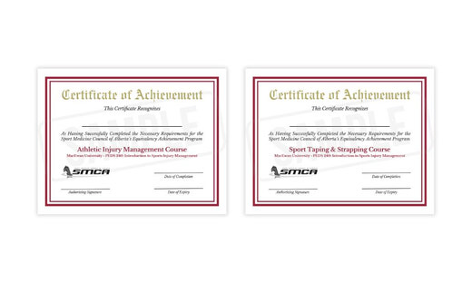 MacEwan University PEDS 240 Student OptionsPEDS 240 -Introduction to Sports Injury Management: Analysis of practical and theoretical concepts of sports injury. Includes an overview of sports medicine, care and prevention of injuries, and safety in athletics and physical education. Students enrolled in physical education or kinesiology programs at post-secondary institutions can earn a Certificate of Achievement in Athletic Injury Management and Sport Taping & Strapping by completing recognized courses. The MacEwan University PEDS 240 Course is currently recognized by the SMCA and is eligible to receive certificates of achievement. |